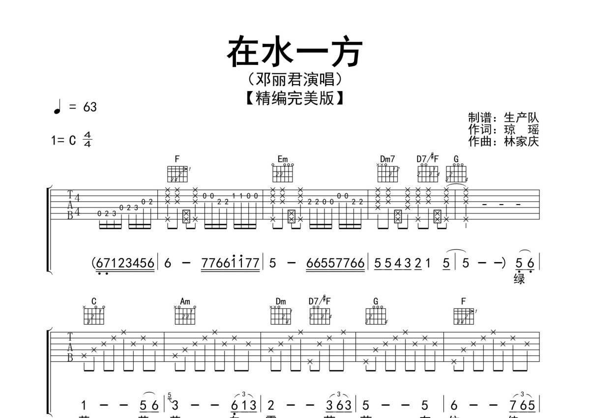曲谱介绍: 邓丽君《在水一方》吉他弹唱谱,采用C调指法编配精编完美版,生产队编配出品,共有3张高清图谱。
