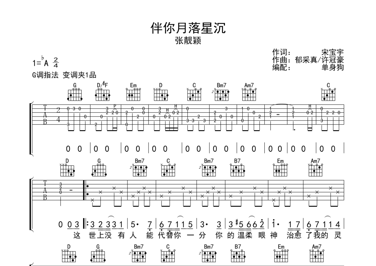曲谱介绍: 张靓颖《伴你月落星沉》吉他弹唱谱,采用G调指法编配,单身狗编配出品,共有2张高清图谱,免翻页排版设计。