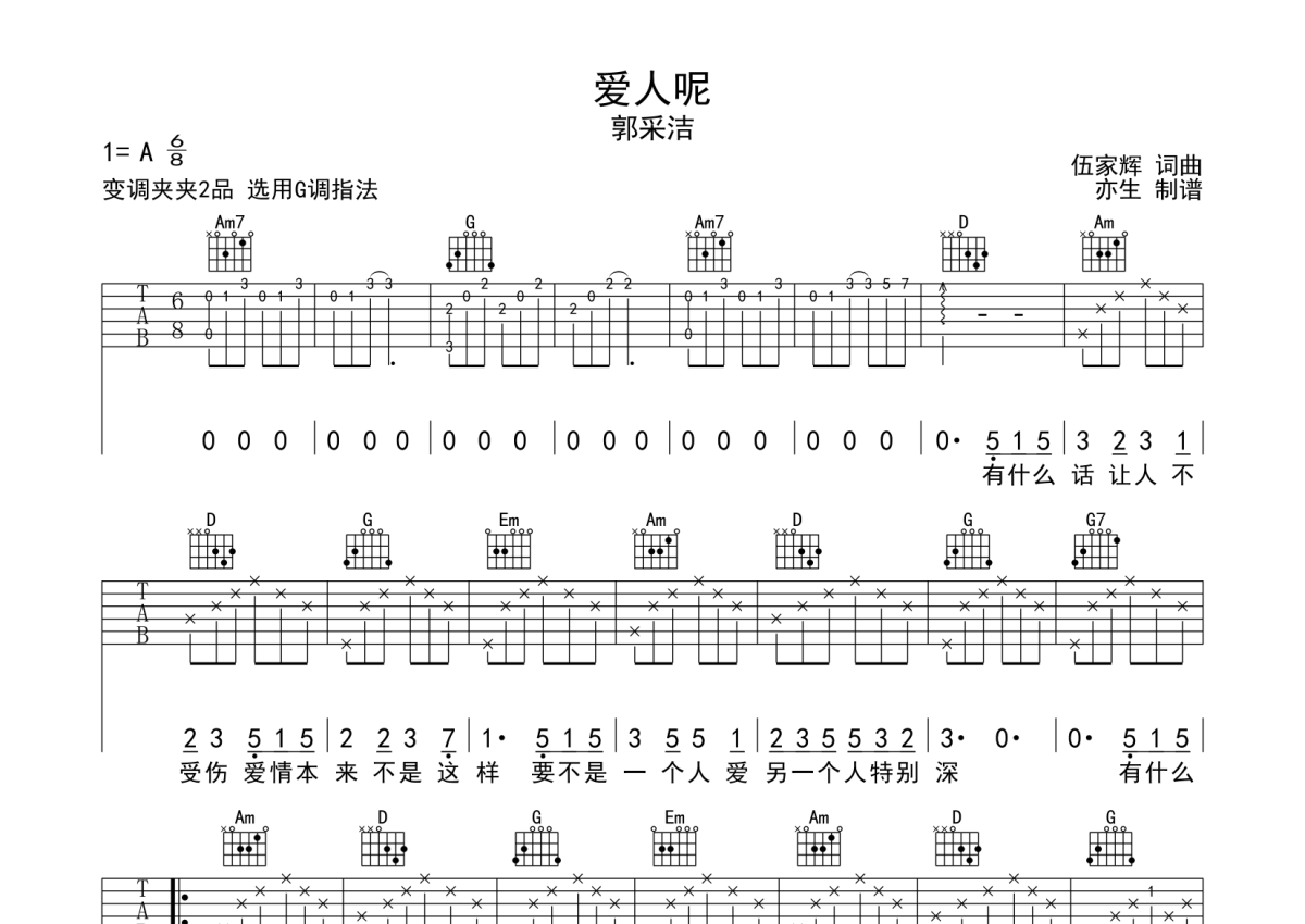 曲谱介绍: 郭采洁《爱人呢》吉他弹唱谱,采用G调指法编配,亦生编配出品,共有2张高清图谱,免翻页排版设计。