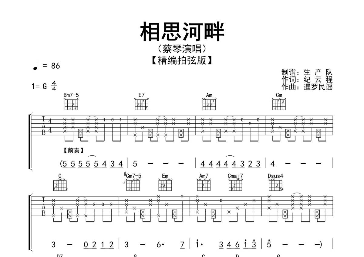 曲谱介绍: 蔡琴《相思河畔》吉他弹唱谱,采用G调指法编配精编拍弦版,生产队编配出品,共有3张高清图谱。