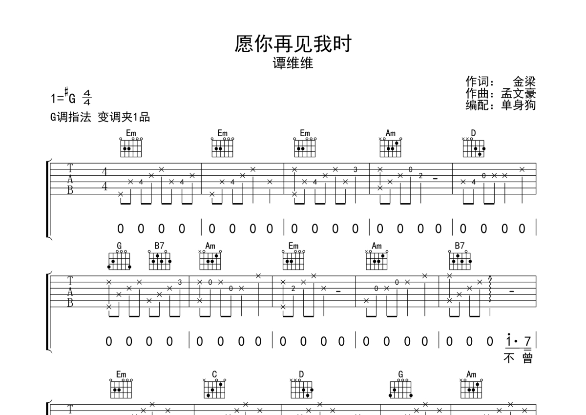 曲谱介绍: 谭维维《愿你再见我时》吉他弹唱谱,采用G调指法编配,单身狗编配出品,共有3张高清图谱。
