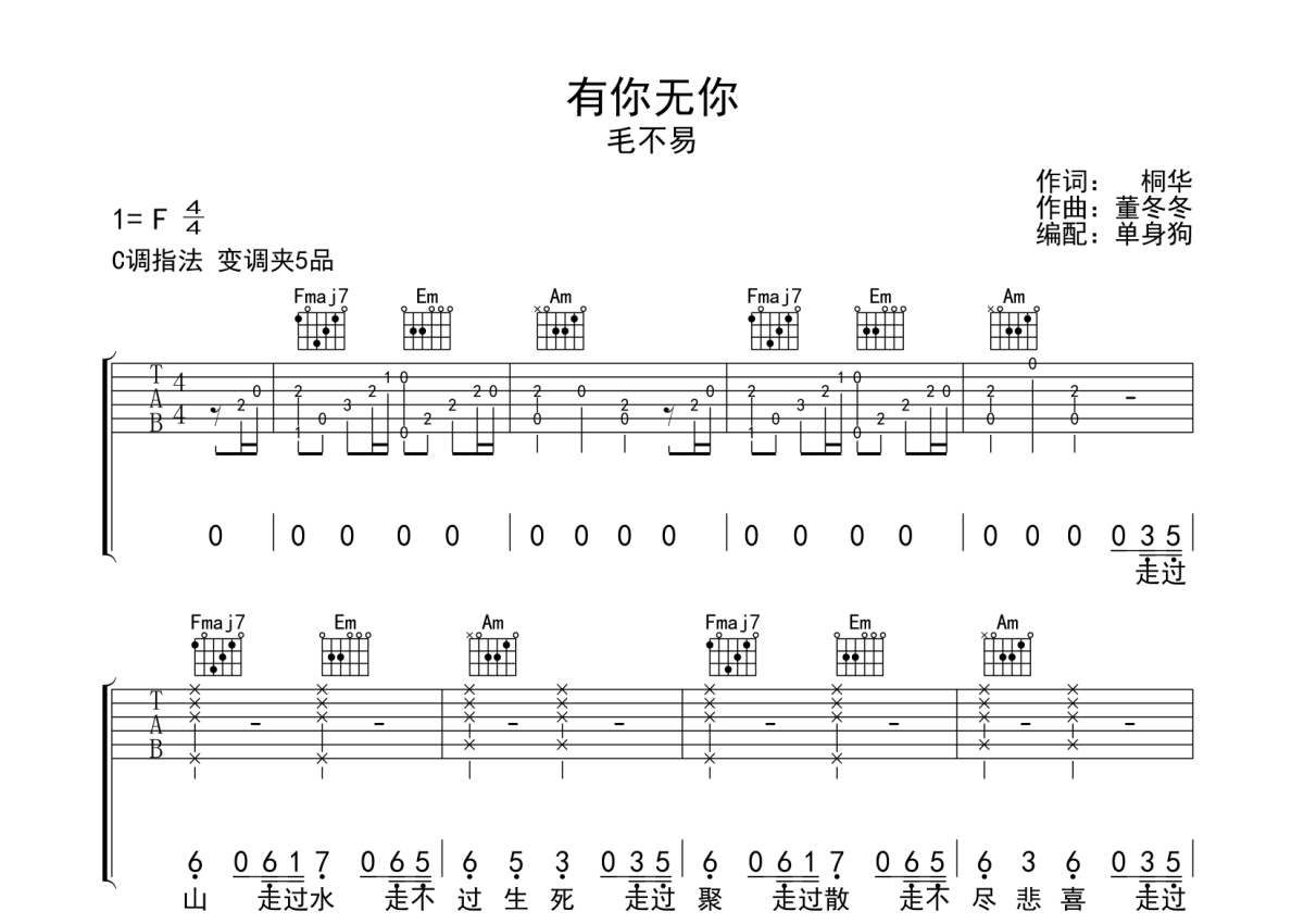 曲谱介绍: 毛不易《有你无你》吉他弹唱谱,采用C调指法编配,单身狗编配出品,共有3张高清图谱。