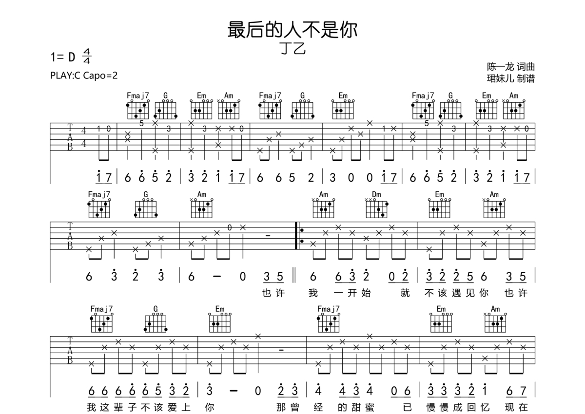 曲谱介绍: 丁乙《最后的人不是你》吉他弹唱谱,采用C调指法编配,珺妹儿编配出品,共有2张高清图谱,免翻页排版设计。