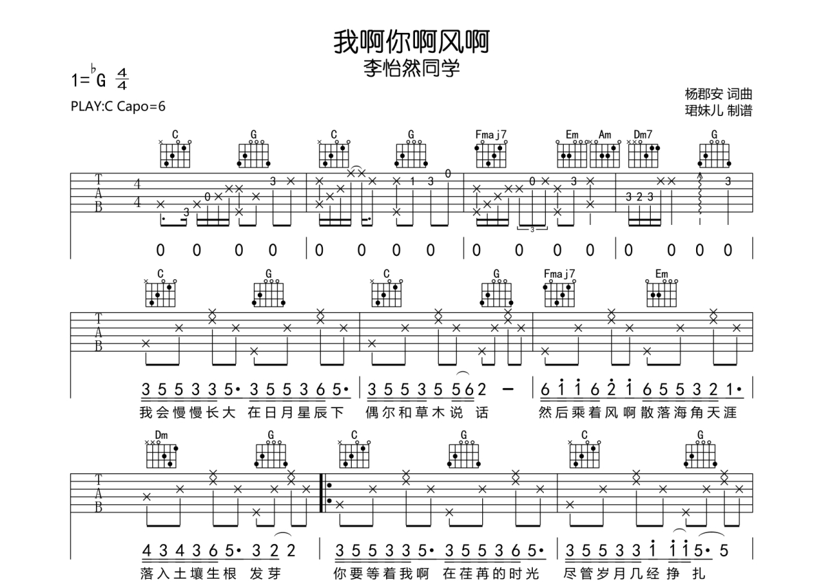 • 我啊你啊风啊吉他谱 - 李怡然同学 - C调吉他弹唱谱第1张