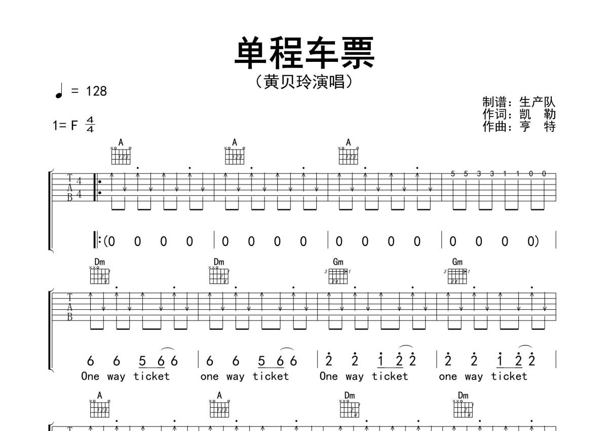 曲谱介绍: 黄贝玲《单程车票》吉他弹唱谱,采用F调指法编配精编扫弦版,生产队编配出品,共有3张高清图谱。