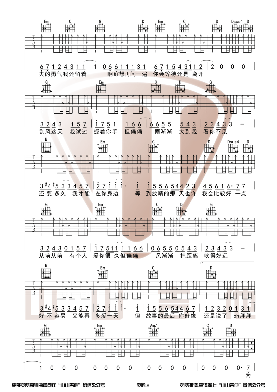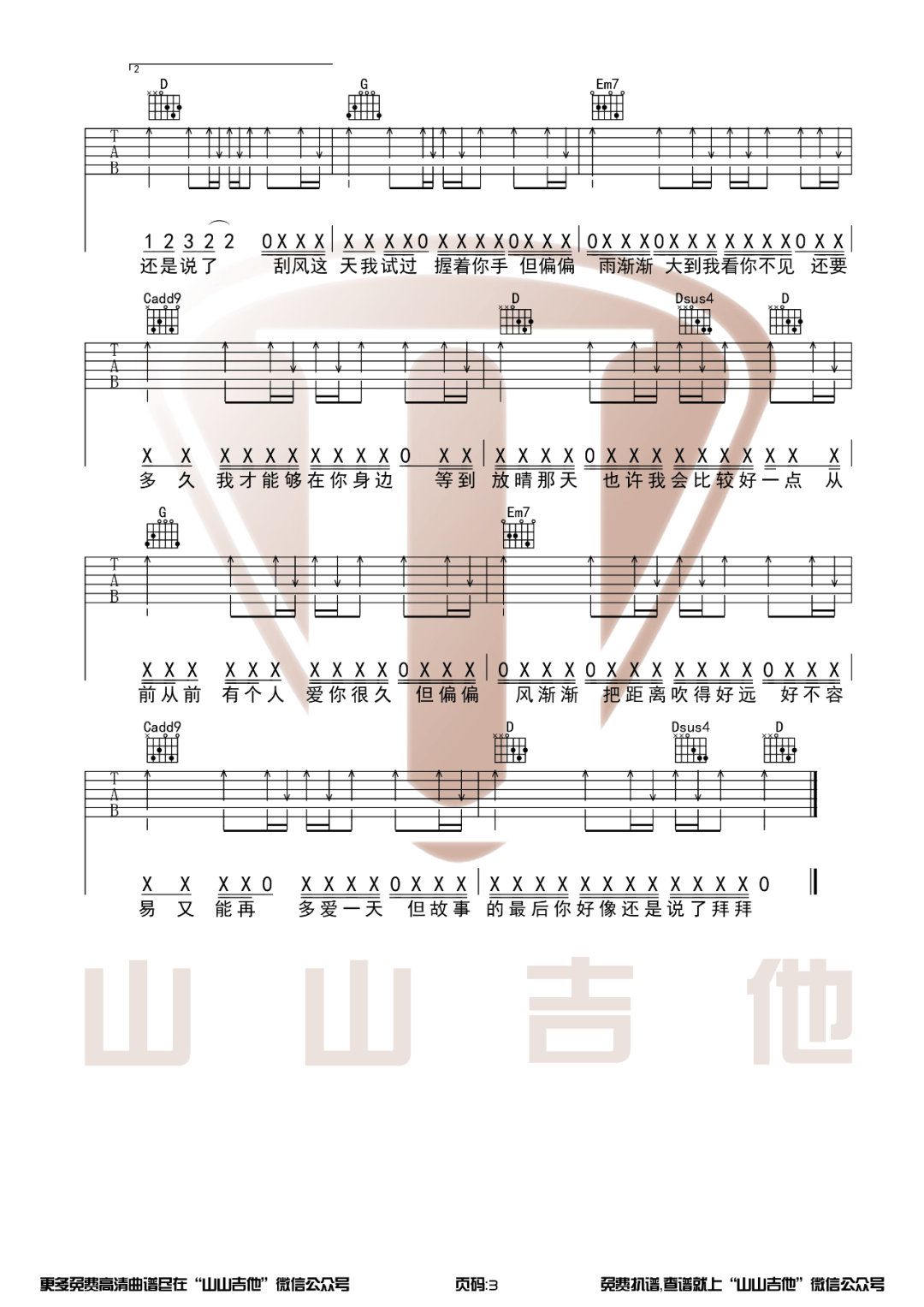 曲谱介绍: 山山吉他《晴天》吉他弹唱谱,共有3张高清图谱。