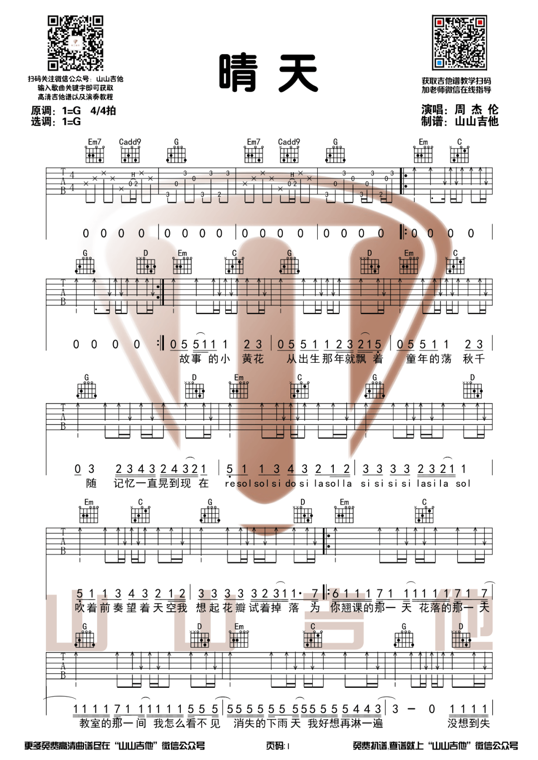 晴天吉他谱 - 山山吉他 - 吉他弹唱谱
