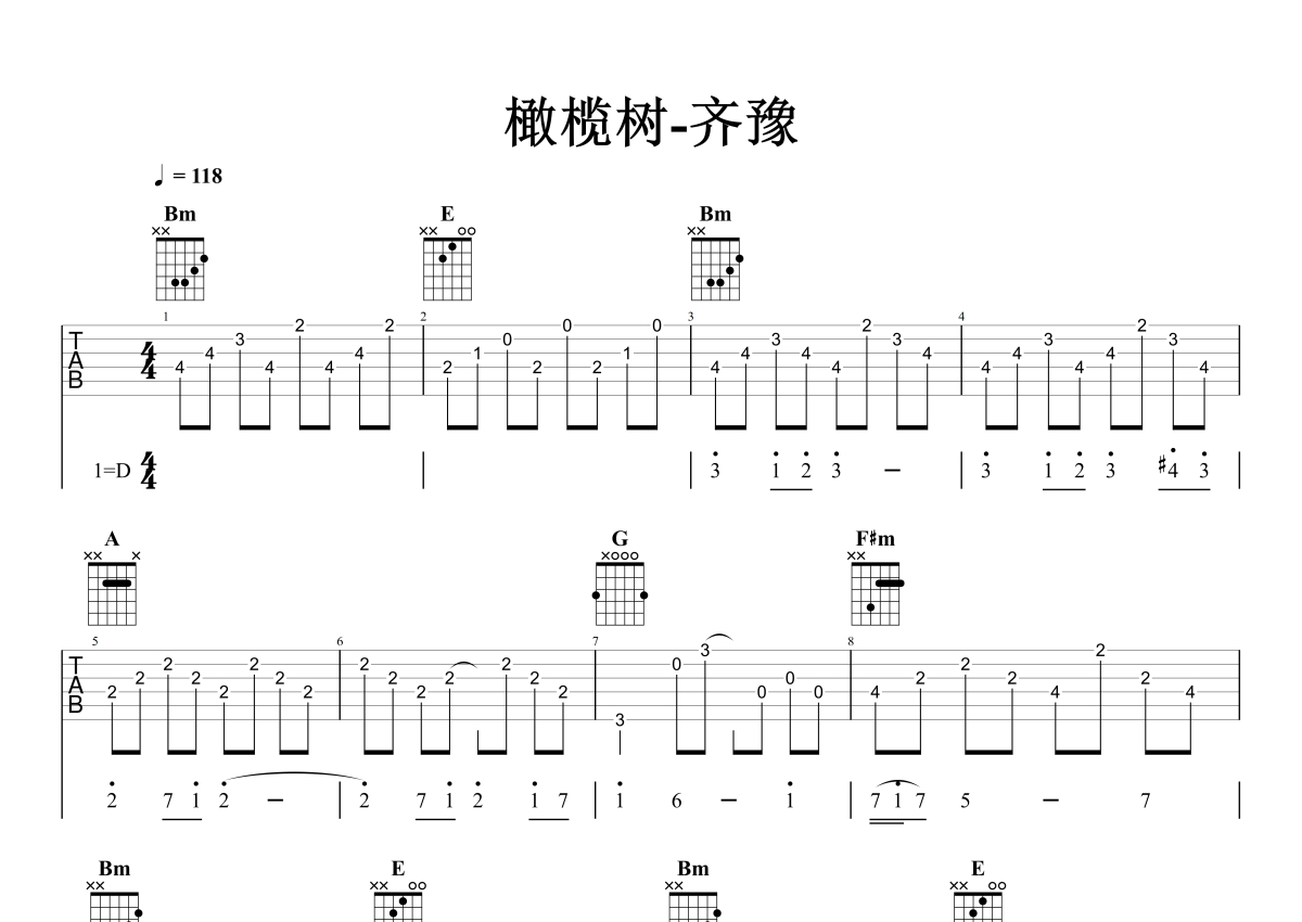 曲谱介绍: 齐豫《橄榄树》吉他弹唱谱,采用D调指法编配石头音乐原版记谱,石头音乐编配出品,共有6张高清图谱。