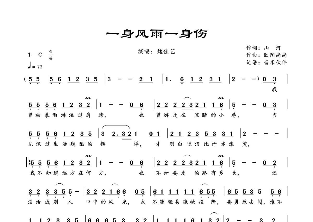 曲谱介绍: 魏佳艺《一身风雨一身伤》,音乐伙伴编配出品,共有1张高清图谱,免翻页排版设计。