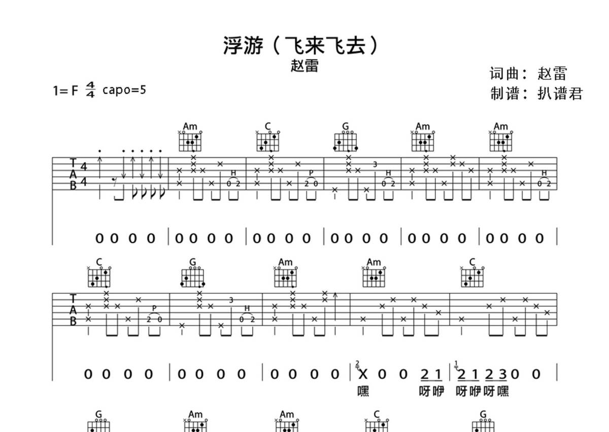 曲谱介绍: 赵雷《浮游》吉他弹唱谱,采用F调指法编配,扒谱君编配出品,共有3张高清图谱。
