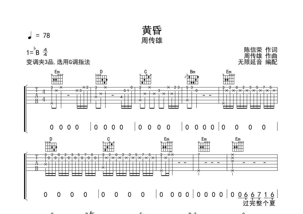 曲谱介绍: 周传雄《黄昏》吉他弹唱谱,采用G调指法编配,无限延音编配出品,共有1张高清图谱,免翻页排版设计。