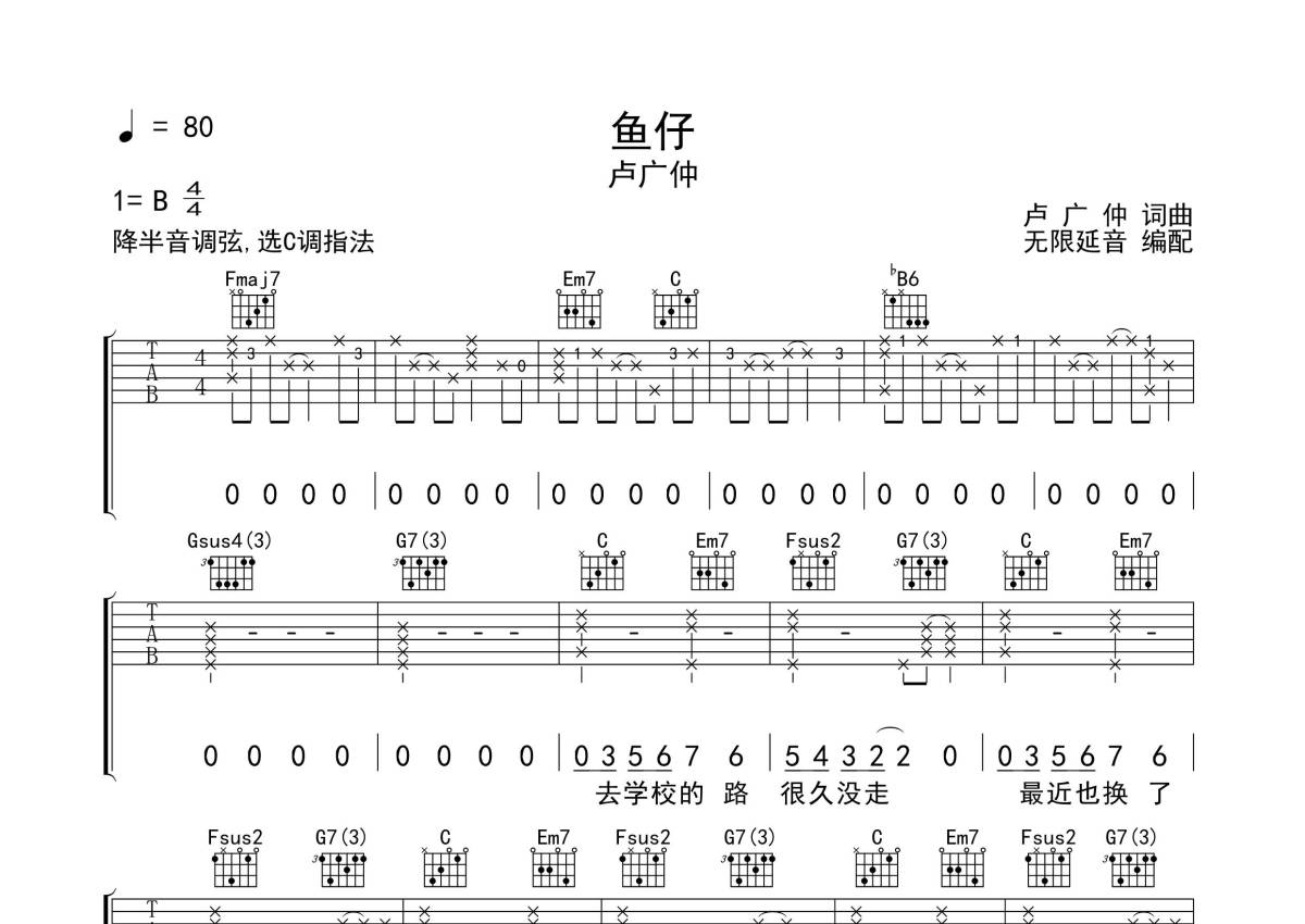 曲谱介绍: 卢广仲《鱼仔》吉他弹唱谱,采用C调指法编配,无限延音编配出品,共有4张高清图谱。