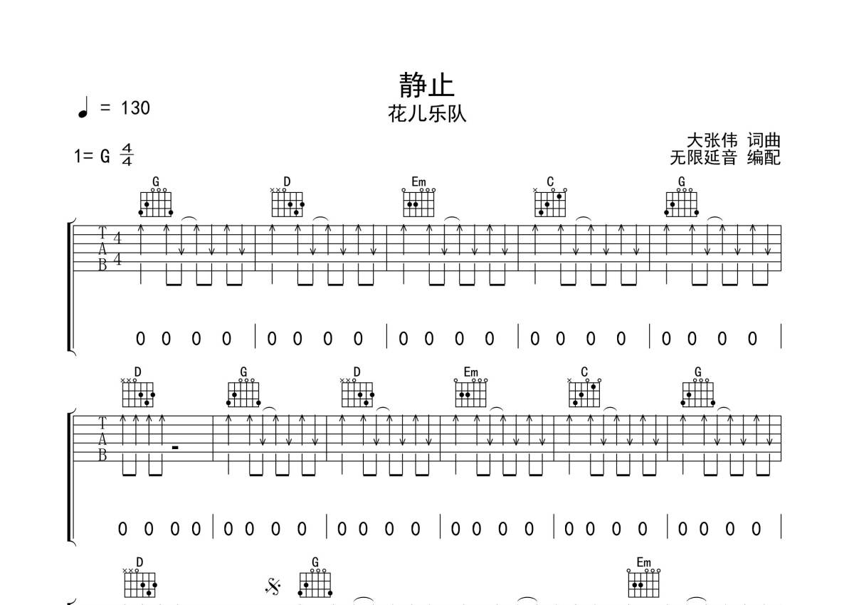 曲谱介绍: 花儿乐队《静止》吉他弹唱谱,采用G调指法编配,无限延音编配出品,共有3张高清图谱。