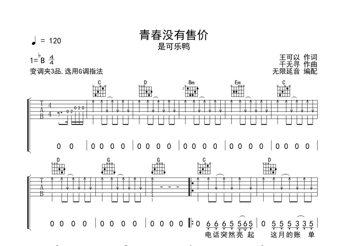曲谱介绍: 是可乐鸭《青春没有售价》吉他弹唱谱,采用G调指法编配,无限延音编配出品,共有3张高清图谱。