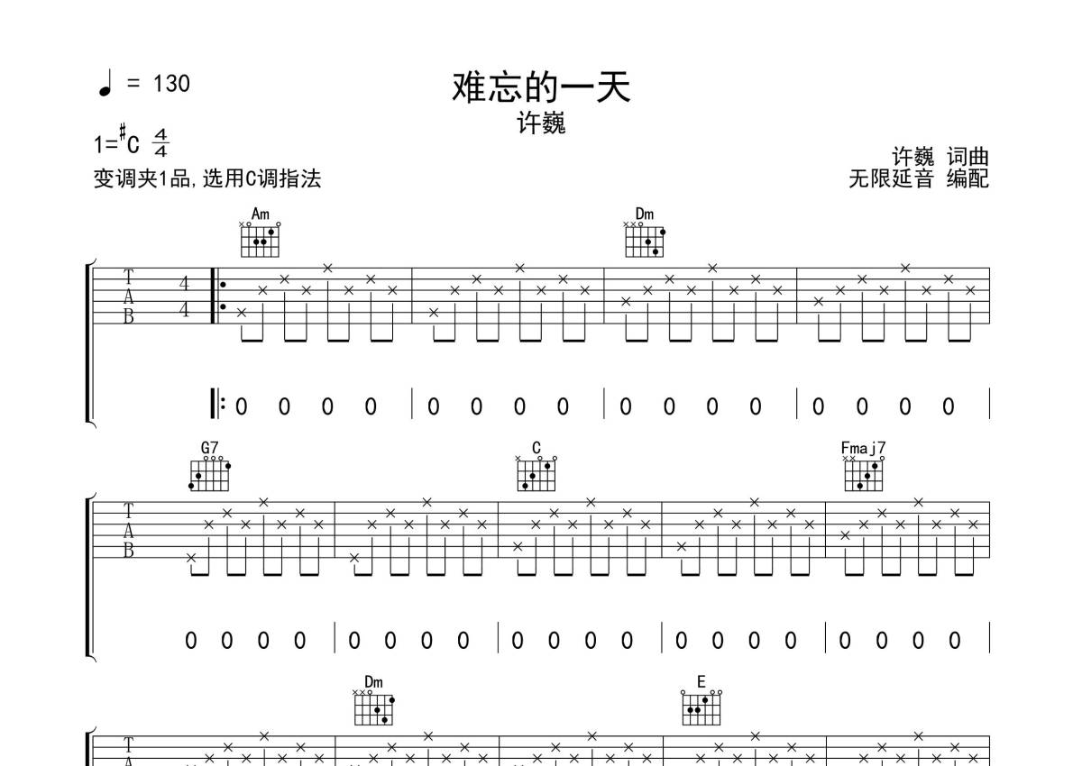 曲谱介绍: 许巍《难忘的一天》吉他弹唱谱,采用C调指法编配,无限延音编配出品,共有3张高清图谱。