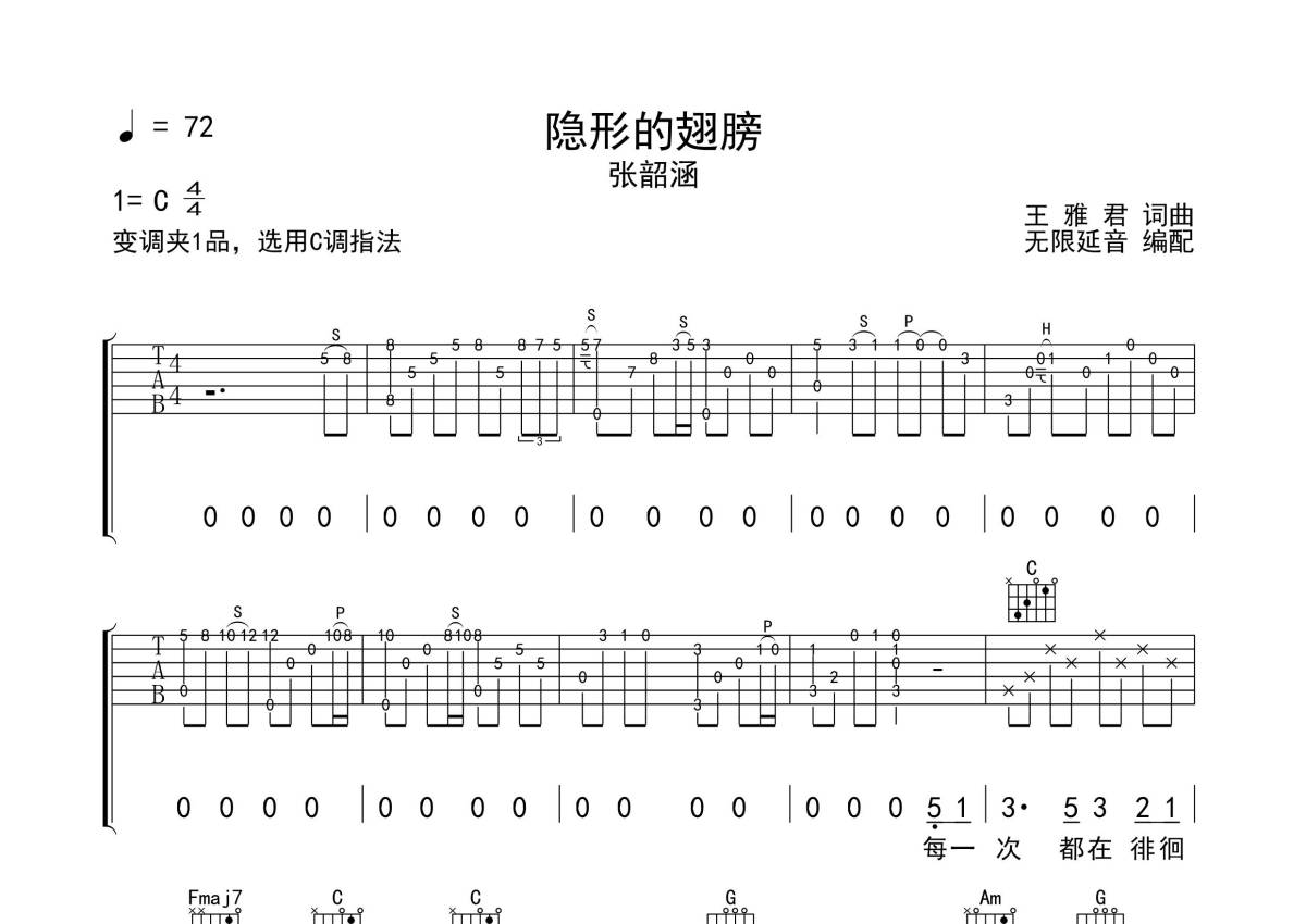 曲谱介绍: 张韶涵《隐形的翅膀》吉他弹唱谱,采用C调指法编配,无限延音编配出品,共有2张高清图谱,免翻页排版设计。
