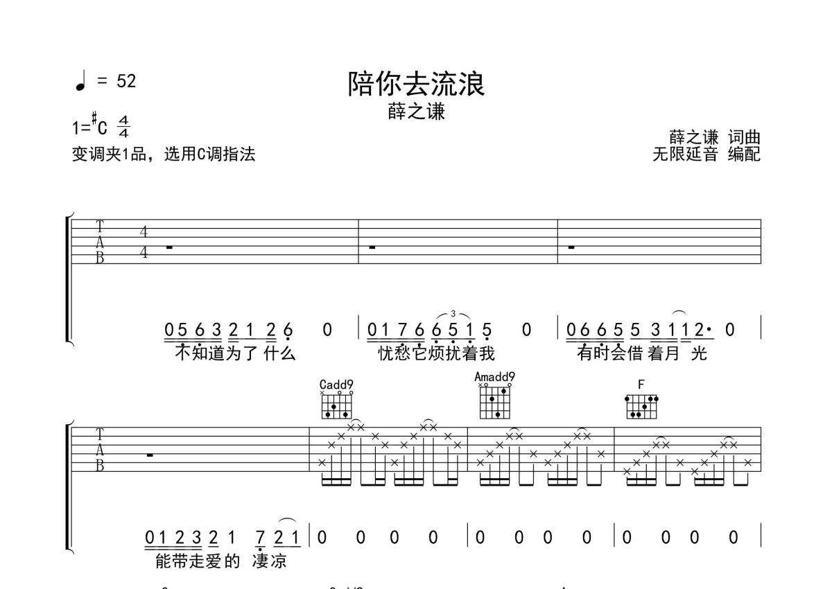 曲谱介绍: 薛之谦《陪你去流浪》吉他弹唱谱,采用C调指法编配,无限延音编配出品,共有3张高清图谱。
