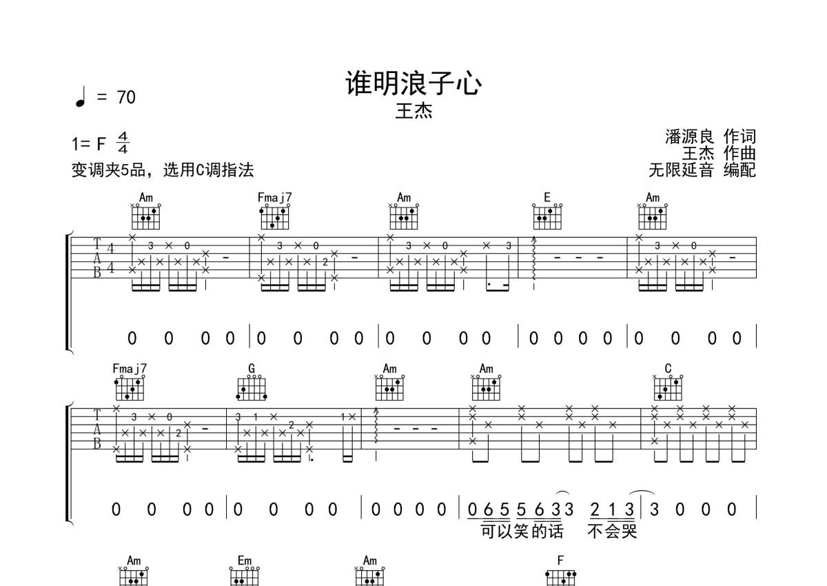曲谱介绍: 王杰《谁明浪子心》吉他弹唱谱,采用C调指法编配,无限延音编配出品,共有3张高清图谱。