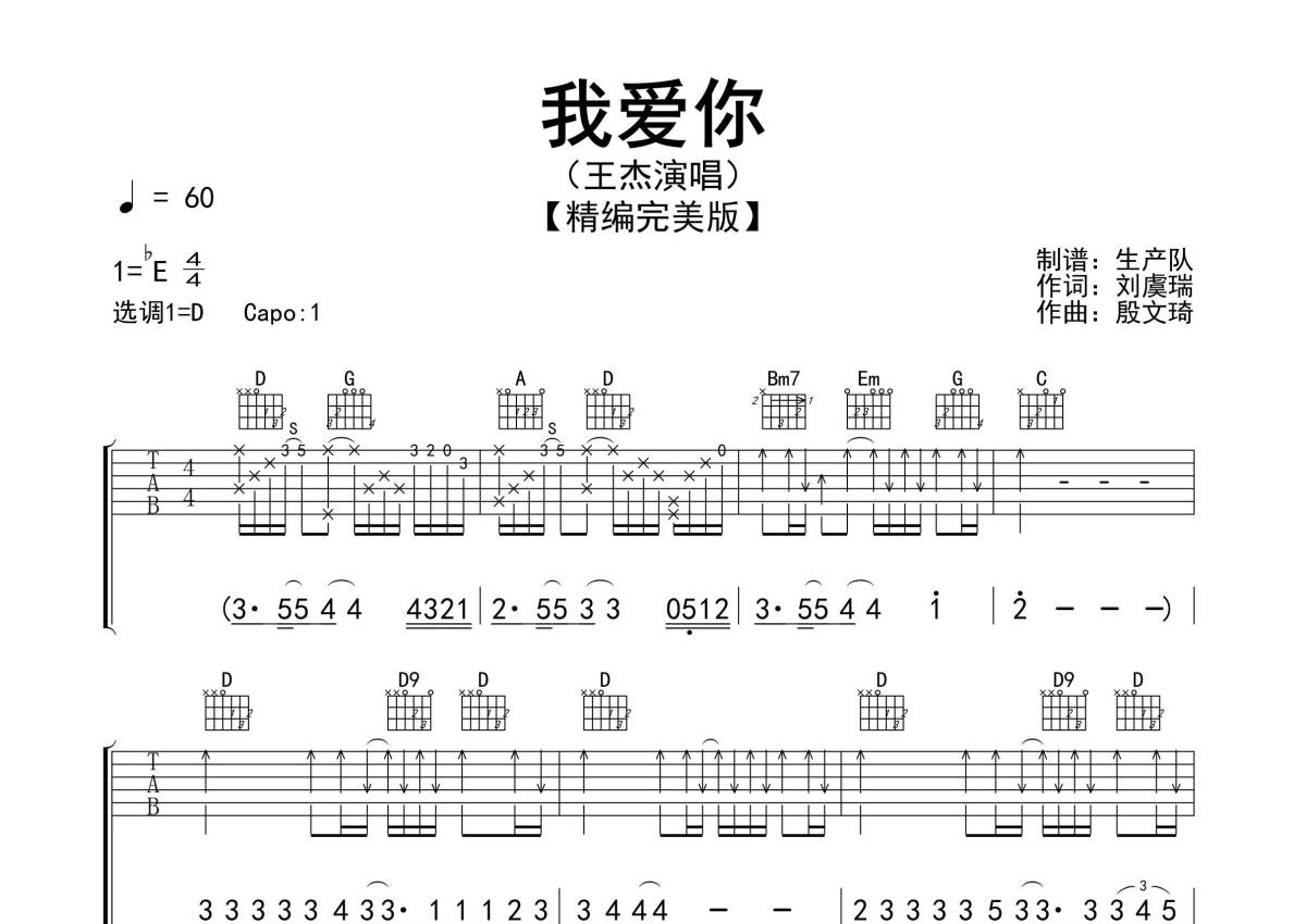 曲谱介绍: 王杰《我爱你》吉他弹唱谱,采用D调指法编配精编完美版,生产队编配出品,共有3张高清图谱。