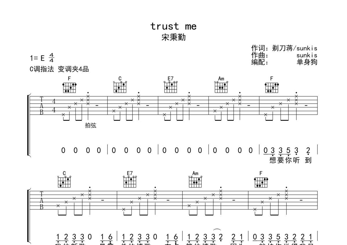 曲谱介绍: 宋秉勤《trustme》吉他弹唱谱,采用C调指法编配,单身狗编配出品,共有4张高清图谱。