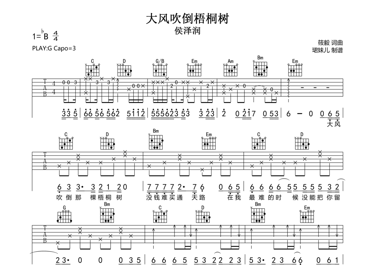 • 大风吹倒梧桐树吉他谱 - 侯泽润 - G调吉他弹唱谱第1张