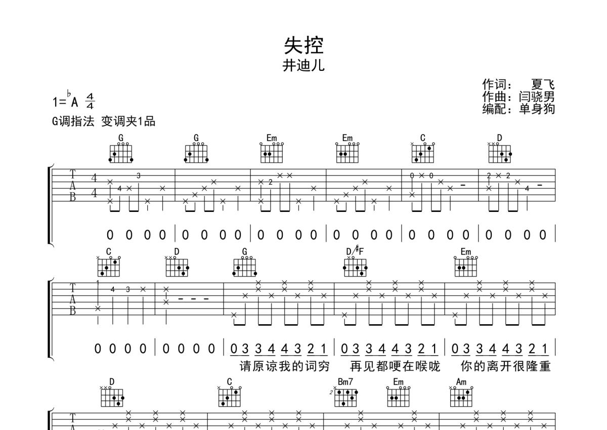 曲谱介绍: 井迪儿《失控》吉他弹唱谱,采用G调指法编配,单身狗编配出品,共有3张高清图谱。