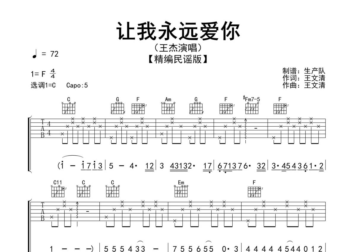 曲谱介绍: 王杰《让我永远爱你》吉他弹唱谱,采用C调指法编配精编民谣版,生产队编配出品,共有3张高清图谱。
