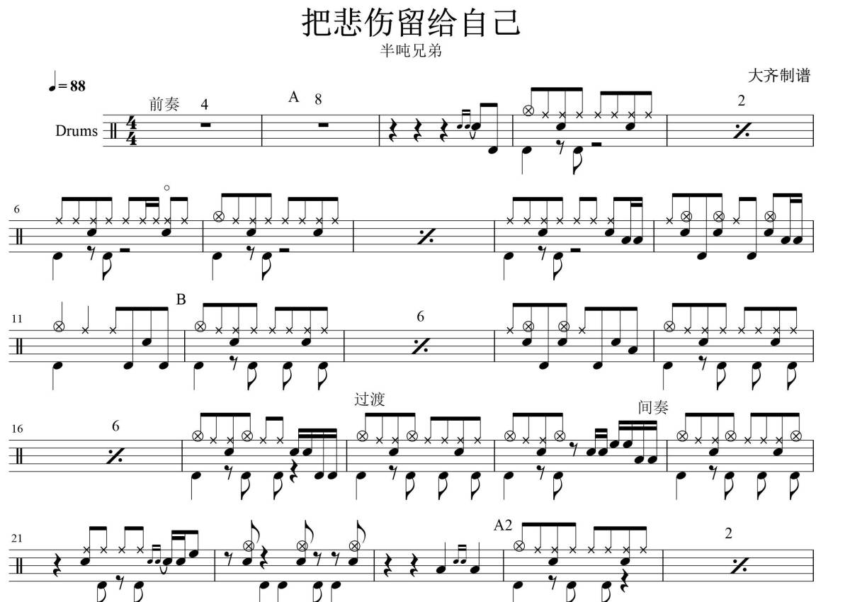 把悲伤留给自己鼓谱 - 半吨兄弟 - 架子鼓谱
