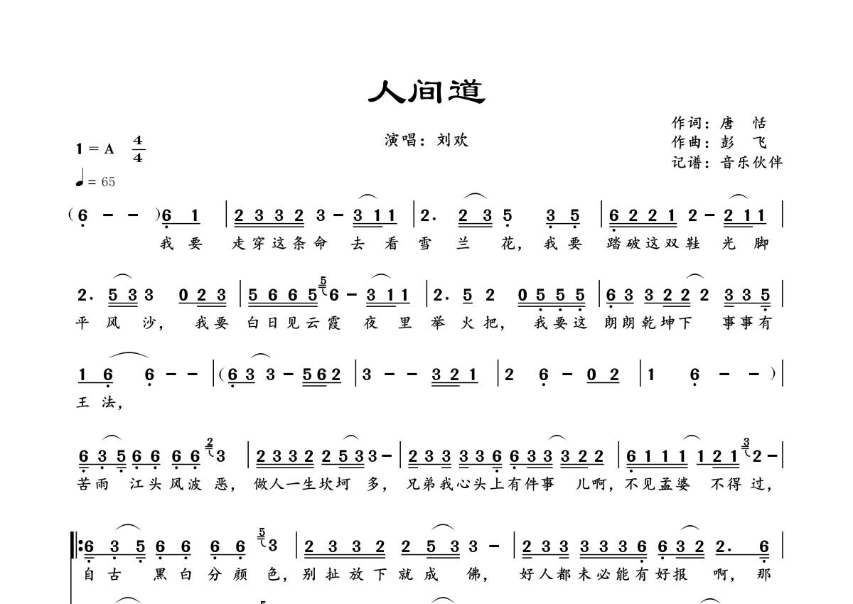 曲谱介绍: 刘欢《人间道》,音乐伙伴编配出品,共有2张高清图谱,免翻页排版设计。