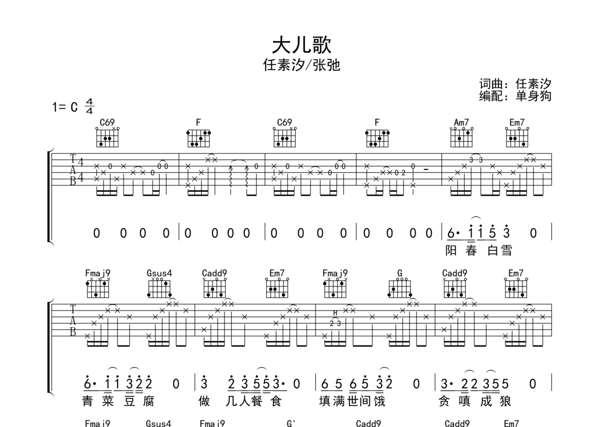 曲谱介绍: 任素汐/张弛《大儿歌》吉他弹唱谱,采用C调指法编配,单身狗编配出品,共有2张高清图谱,免翻页排版设计。