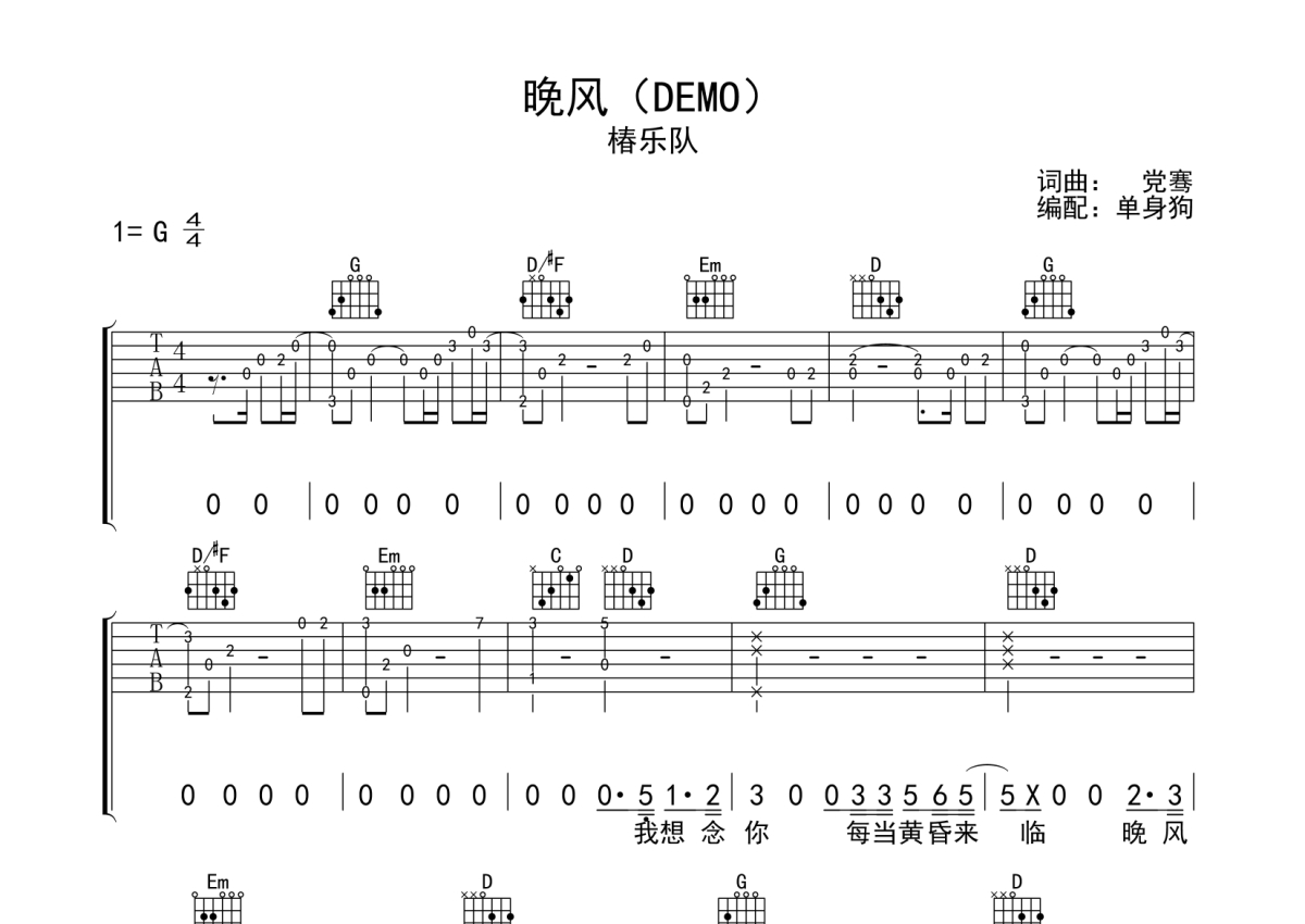 曲谱介绍: 椿乐队《晚风》吉他弹唱谱,采用G调指法编配,单身狗编配出品,共有2张高清图谱,免翻页排版设计。