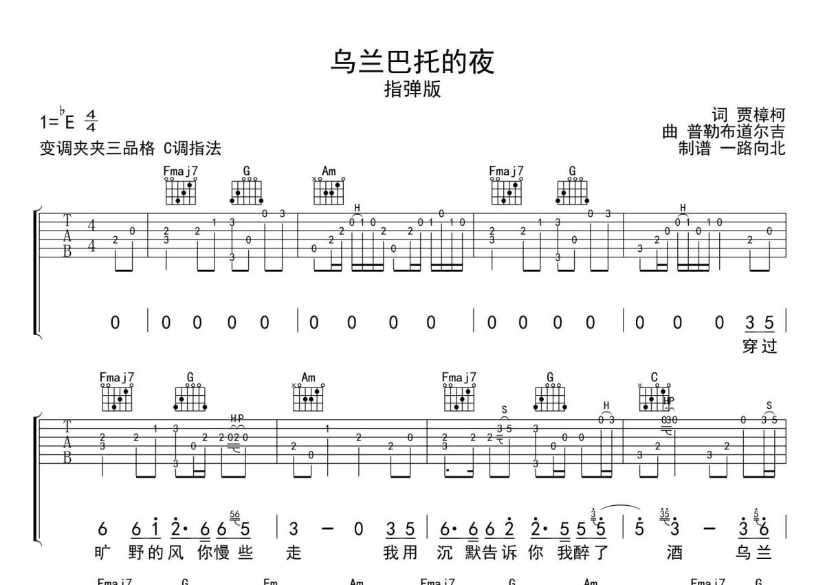 曲谱介绍: 丹正母子《乌兰巴托的夜》吉他独奏谱,采用C调指法编配独奏,圆创吉他谱编配出品,共有3张高清图谱。