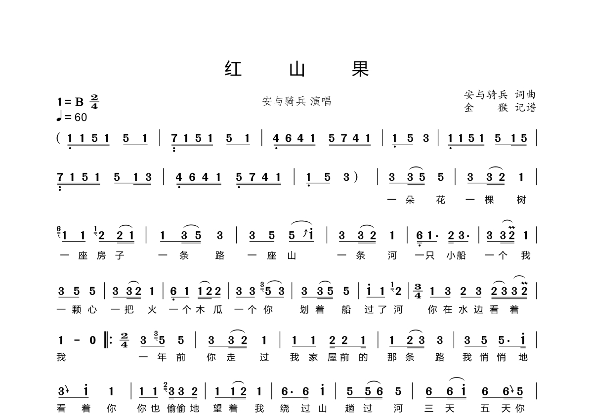 曲谱介绍: 安与骑兵《红山果》,金猴奋起千钧棒编配出品,共有1张高清图谱,免翻页排版设计。