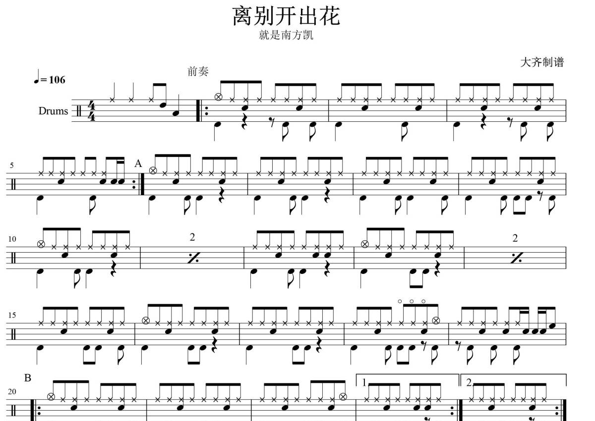 曲谱介绍: 就是南方凯《离别开出花》架子鼓谱,大齐编配出品,共有2张高清图谱,免翻页排版设计。