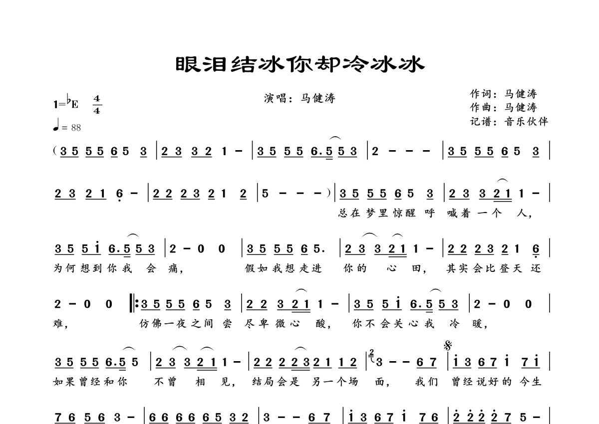 眼泪结冰你却冷冰冰简谱 - 马健涛