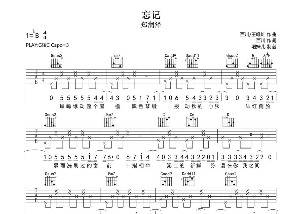 曲谱介绍: 郑润泽《忘记》吉他弹唱谱,采用G调指法编配,珺妹儿编配出品,共有3张高清图谱。