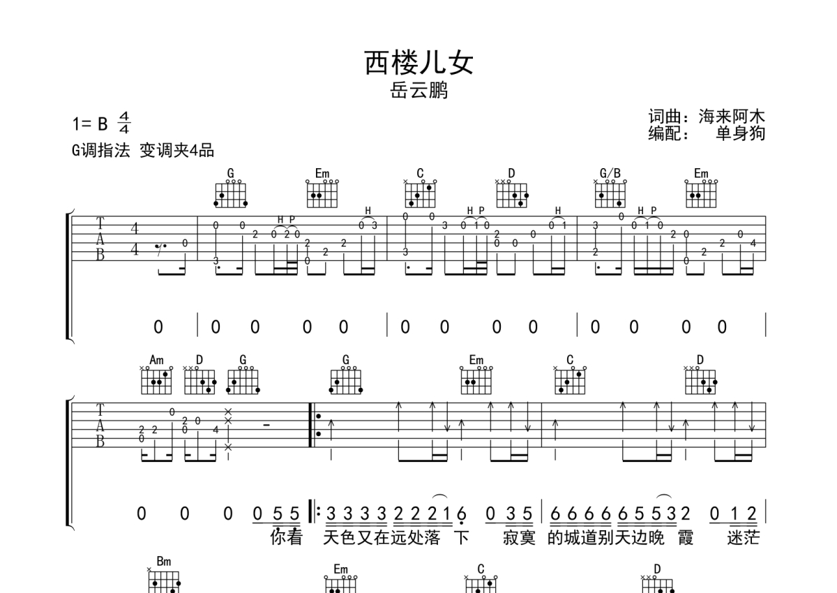 曲谱介绍: 岳云鹏《西楼儿女》吉他弹唱谱,采用G调指法编配,单身狗编配出品,共有3张高清图谱。