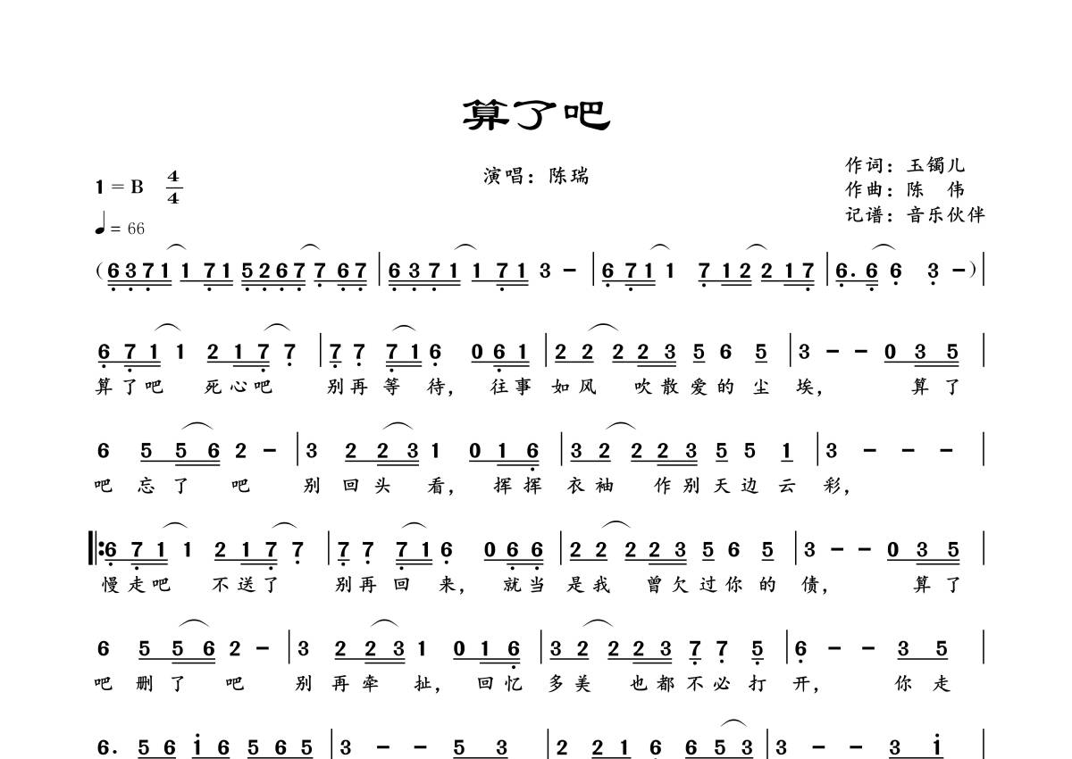 曲谱介绍: 陈瑞《算了吧》,音乐伙伴编配出品,共有1张高清图谱,免翻页排版设计。