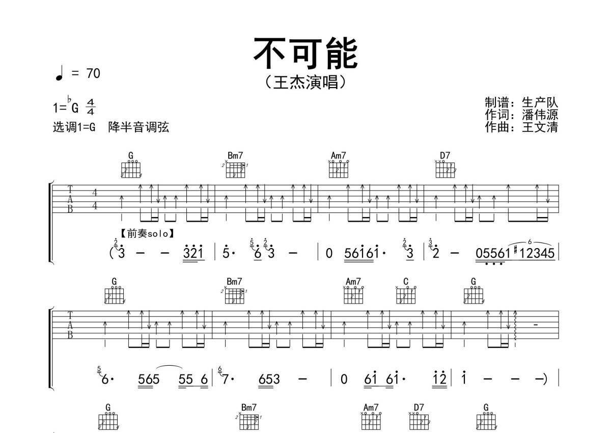 曲谱介绍: 王杰《不可能》吉他弹唱谱,采用G调指法编配精编完美版,生产队编配出品,共有3张高清图谱。