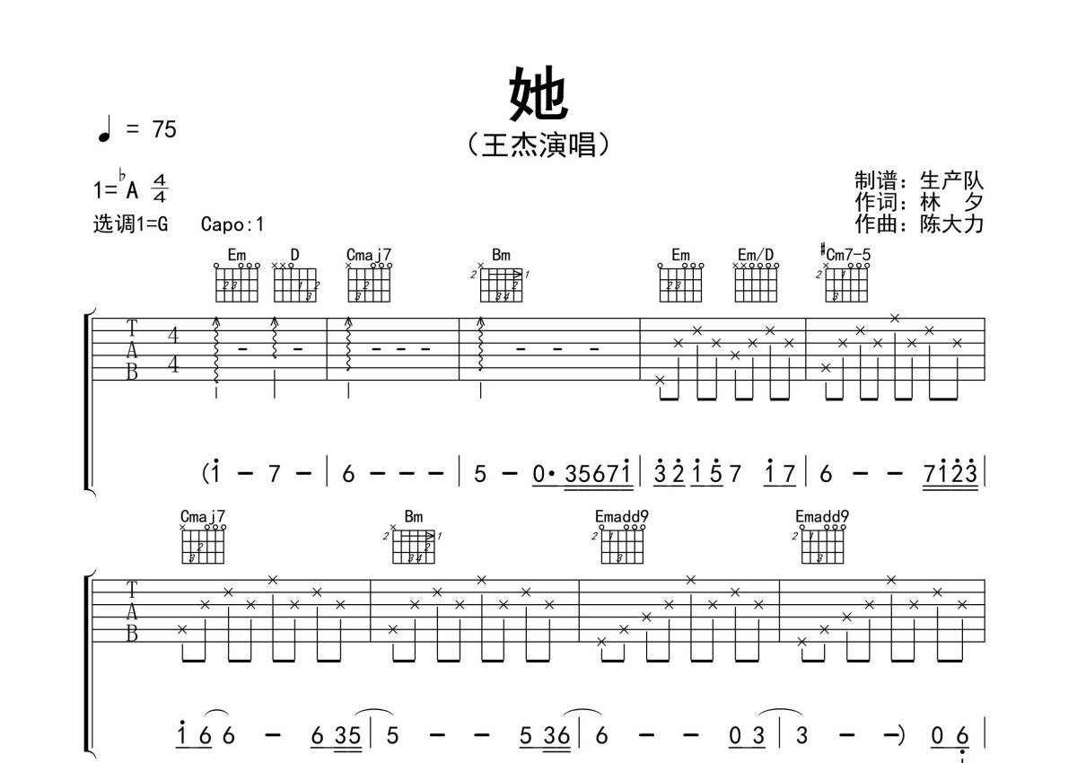 曲谱介绍: 王杰《她》吉他弹唱谱,采用G调指法编配精编民谣版,生产队编配出品,共有3张高清图谱。