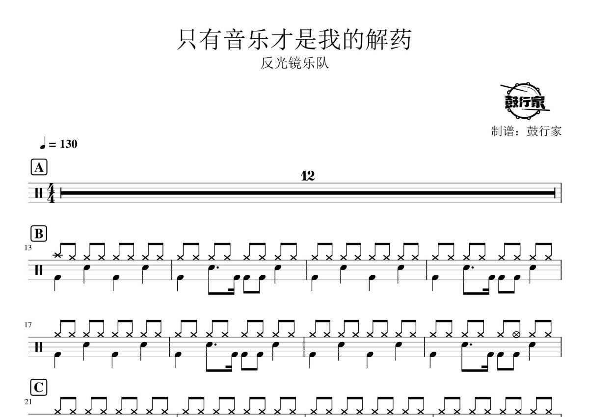 曲谱介绍: 反光镜乐队《只有音乐才是我的解药》架子鼓谱,鼓行家编配出品,共有2张高清图谱,免翻页排版设计。