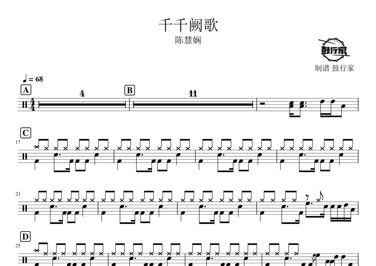 曲谱介绍: 陈慧娴《千千阙歌》架子鼓谱,鼓行家编配出品,共有2张高清图谱,免翻页排版设计。