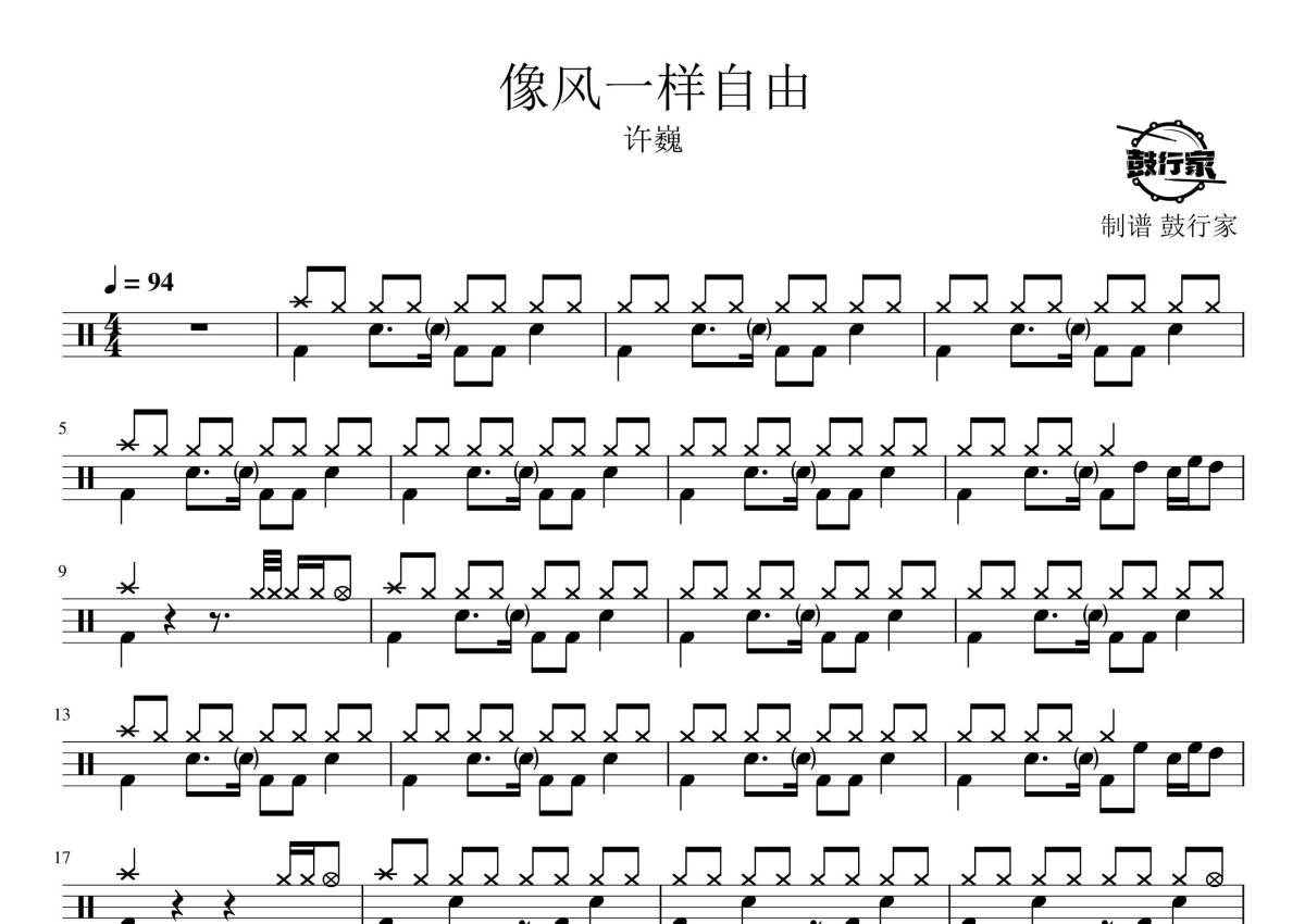 曲谱介绍: 许巍《像风一样自由》架子鼓谱,鼓行家编配出品,共有2张高清图谱,免翻页排版设计。