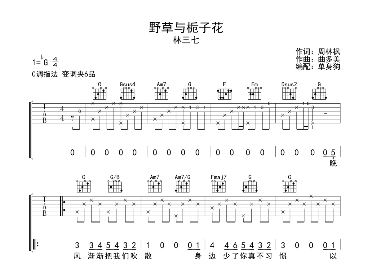 曲谱介绍: 林三七《野草与栀子花》吉他弹唱谱,采用C调指法编配,单身狗编配出品,共有2张高清图谱,免翻页排版设计。