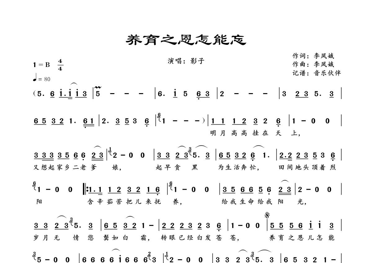 曲谱介绍: 影子《养育之恩怎能忘》,音乐伙伴编配出品,共有1张高清图谱,免翻页排版设计。