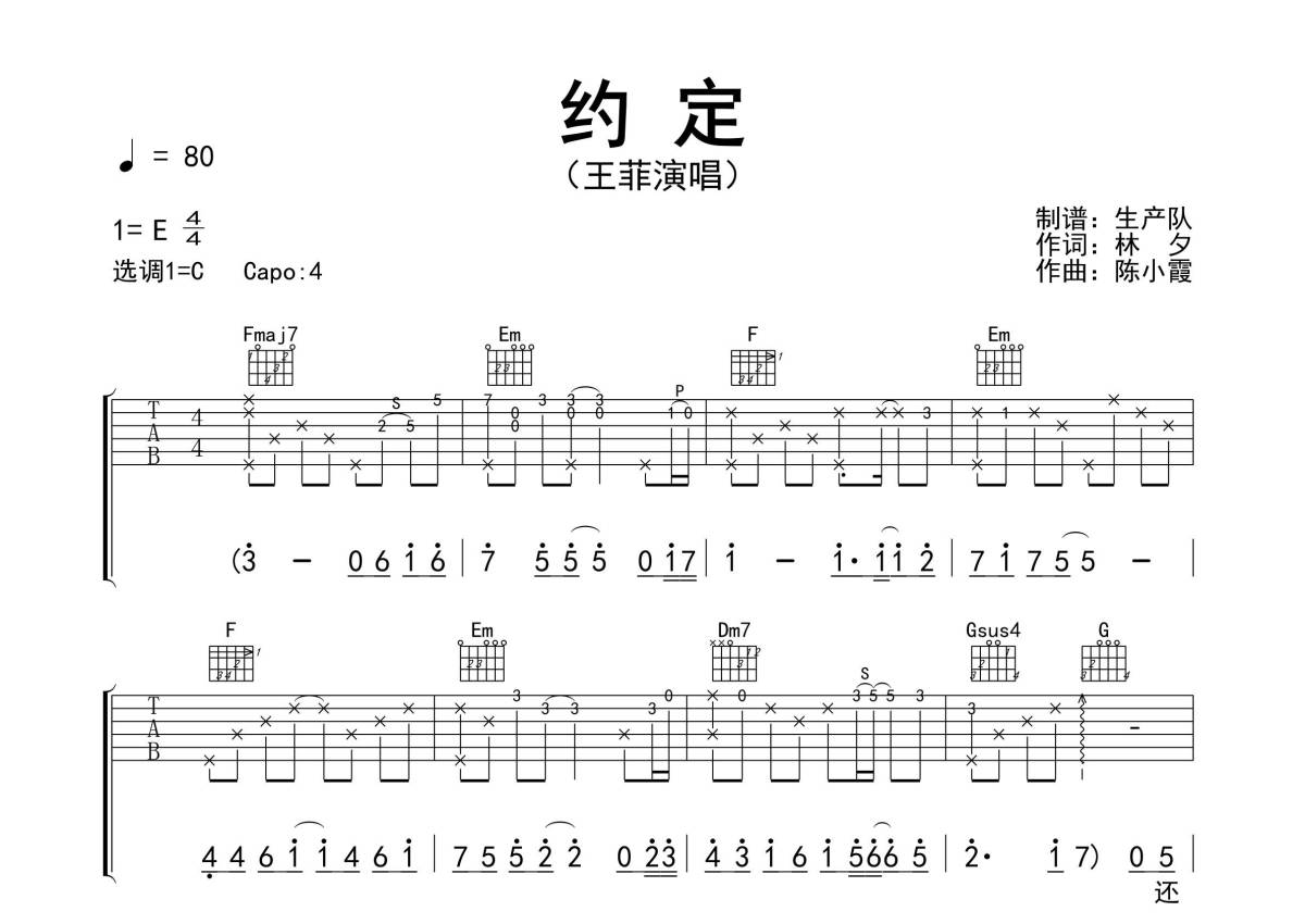 曲谱介绍: 王菲《约定》吉他弹唱谱,采用C调指法编配精编完美版,生产队编配出品,共有3张高清图谱。