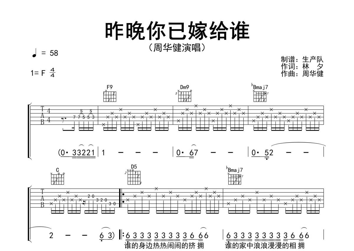 曲谱介绍: 周华健《昨晚你已嫁给谁》吉他弹唱谱,采用F调指法编配精编完美版,生产队编配出品,共有3张高清图谱。