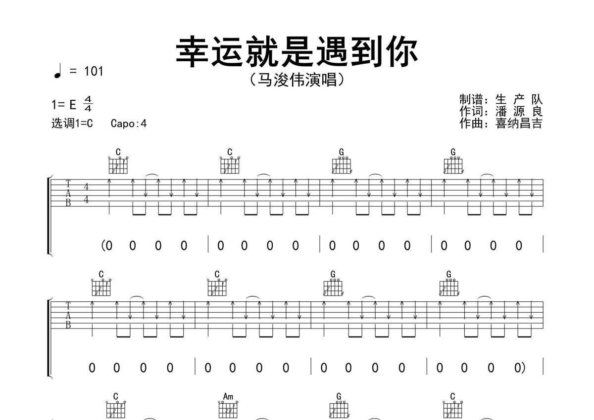 曲谱介绍: 马浚伟《幸运就是遇到你》吉他弹唱谱,采用C调指法编配精编扫弦版,生产队编配出品,共有3张高清图谱。