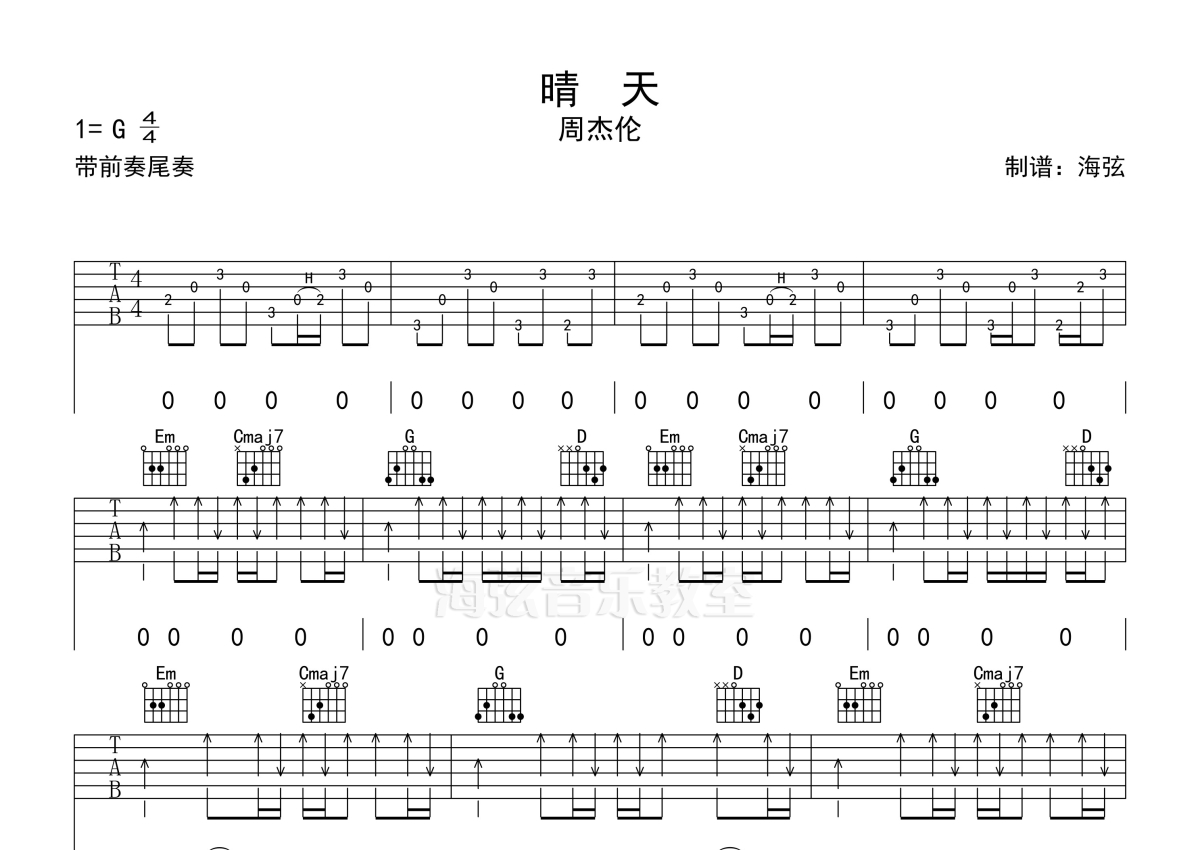 曲谱介绍: 周杰伦《晴天》吉他弹唱谱,采用G调指法编配,海弦编配出品,共有3张高清图谱。