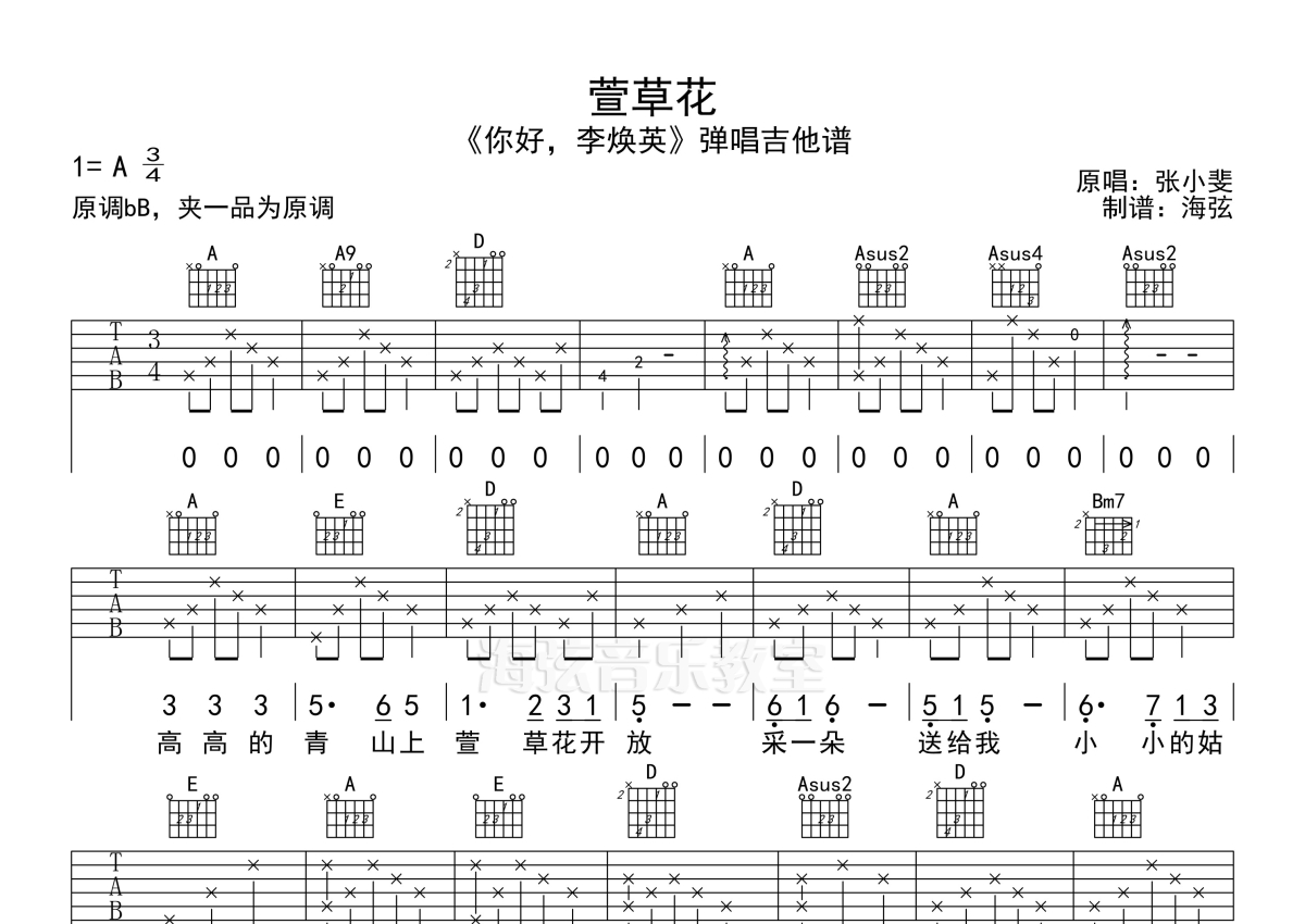 • 萱草花吉他谱 - 张小斐 - A调吉他弹唱谱第1张